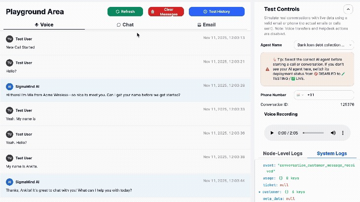 Developer-Centric Testing Environment: The integrated Playground lets teams simulate real multi-channel customer journeys before deployment. Test how your agent handles channel transitions - all without writing complex integration code.