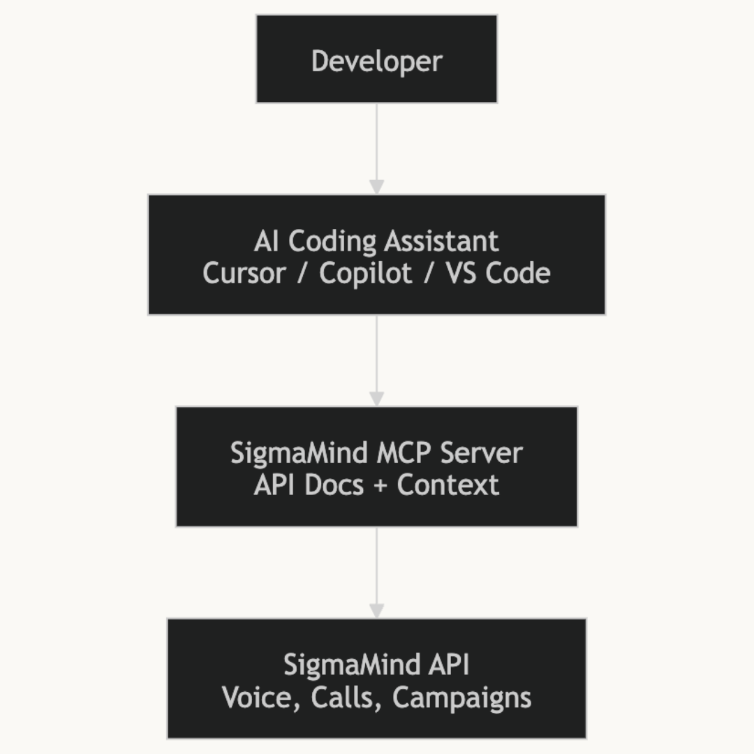 Learn how the SigmaMind MCP Server enables Cursor, VS Code, Copilot, and other AI coding assistants to access our APIs and build voice & chat AI integrations faster.